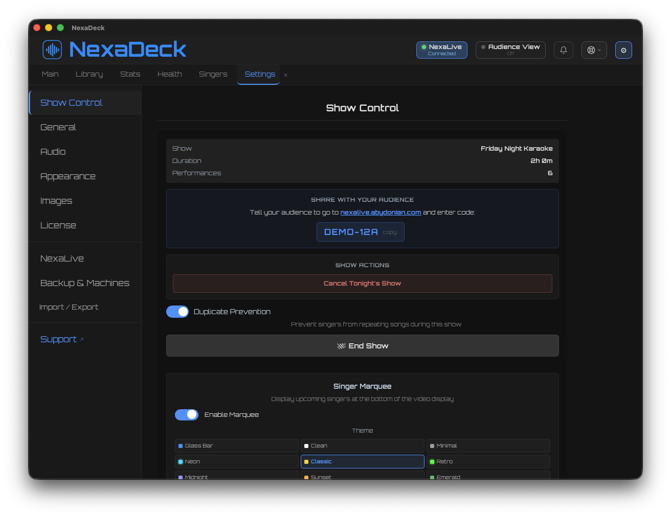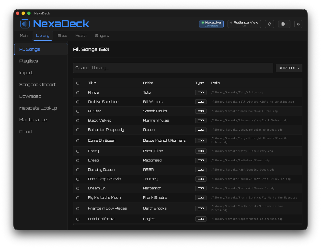 Connect to NexaLive for real-time audience song requests delivered straight to your rotation queue.