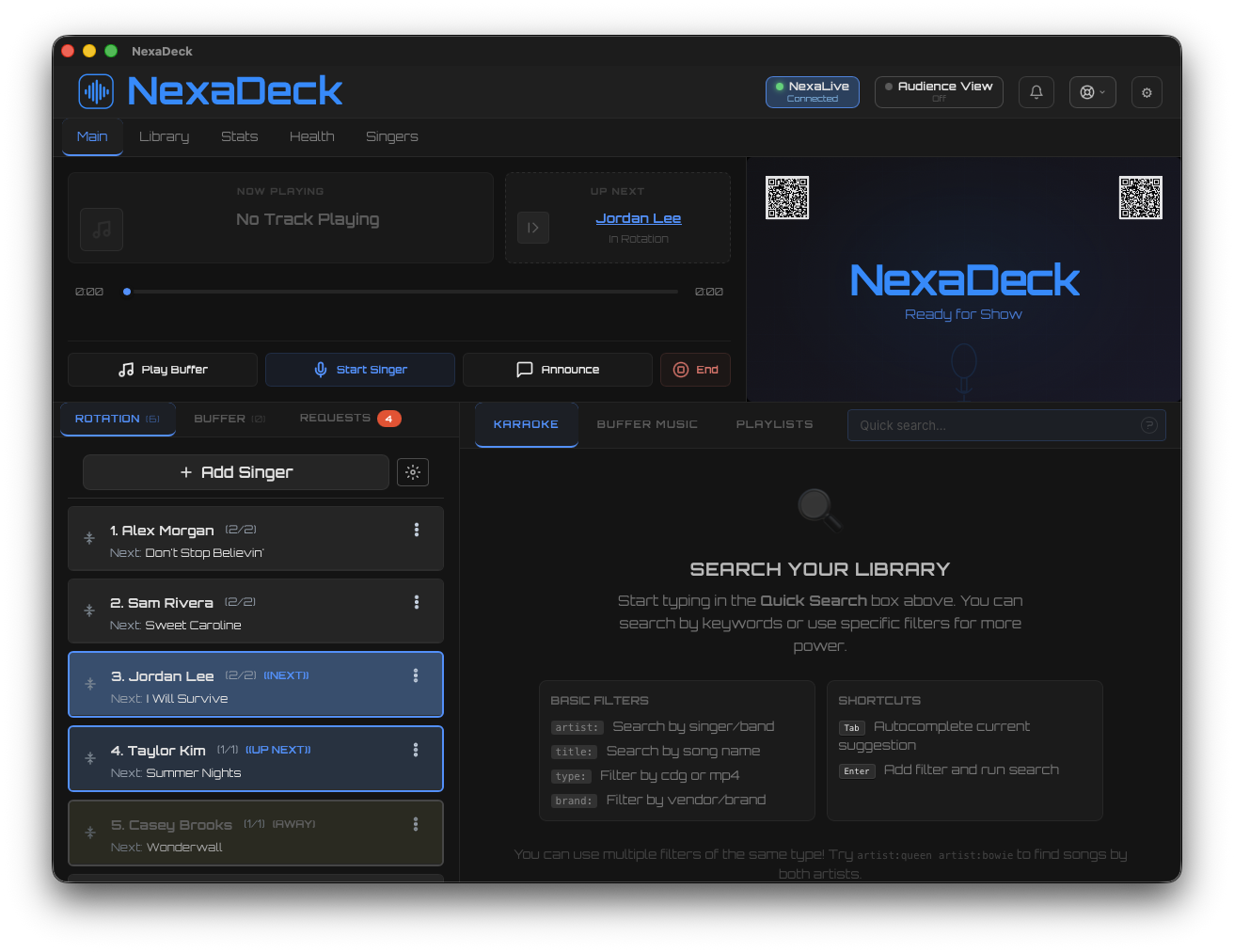 NexaDeck and NexaLive are powerful on their own, but they are built to work together. Sync your library to the cloud, receive audience requests directly in your rotation queue, and manage everything from a single connected workflow. Your audience gets a modern, friction-free experience, and you get total control.
