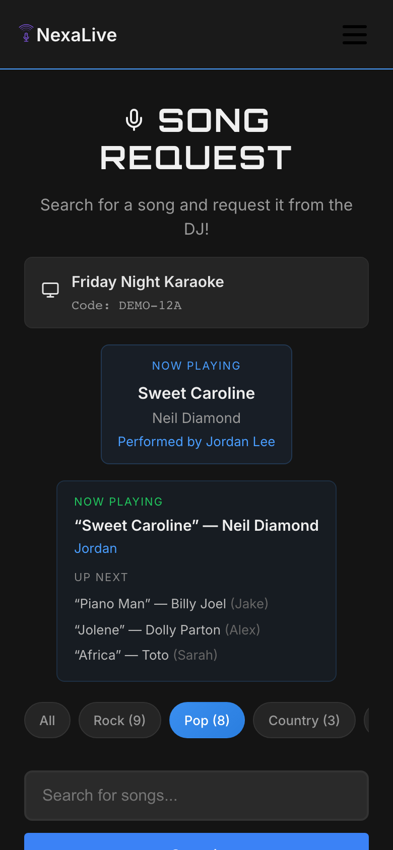 Find a song, tap request, done. Minimal friction means more audience participation and happier crowds.
